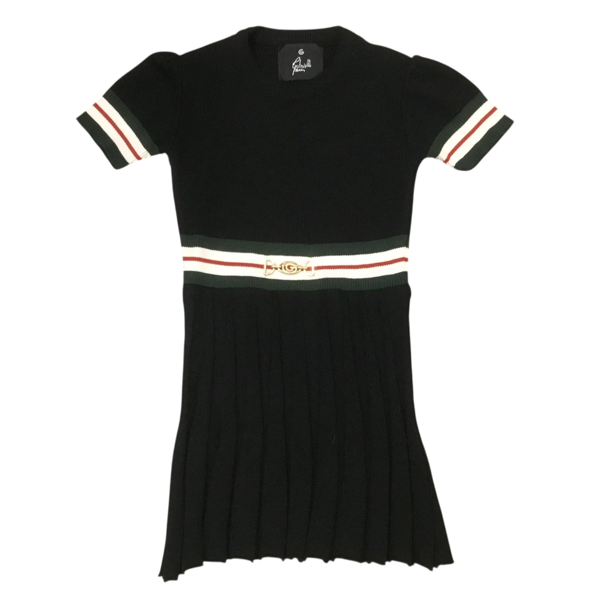 Abito in maglia mezza manica nero con tramatura iconica Gucci sulla cintura e fibia.