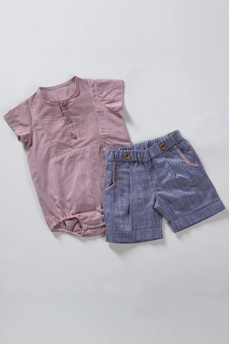 Body a camicia in tela di cotone rigato con taglio quadro e bermuda in tela di cotone effetto jeans