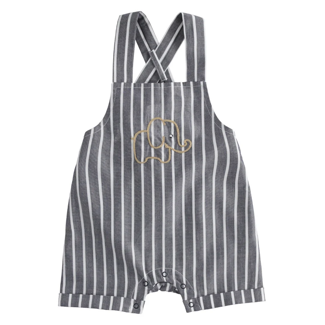 Salopette corta in tessuto navetta a fantasia rigata con scritta.