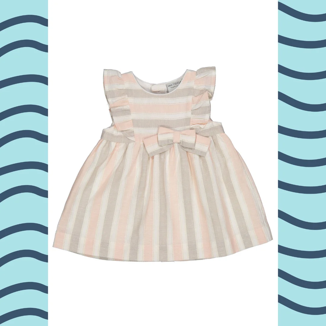 Abito a maniche corte in misto lino rigato con lurex.