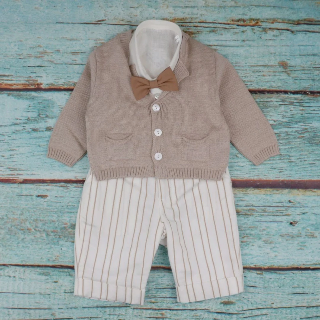 Completo composto da cardigan in filo, pantaloncini a fantasia e camicia. Articolo: EM60463 BRAND – Marlù Articolo certificato e prodotto esclusivamente in Italia