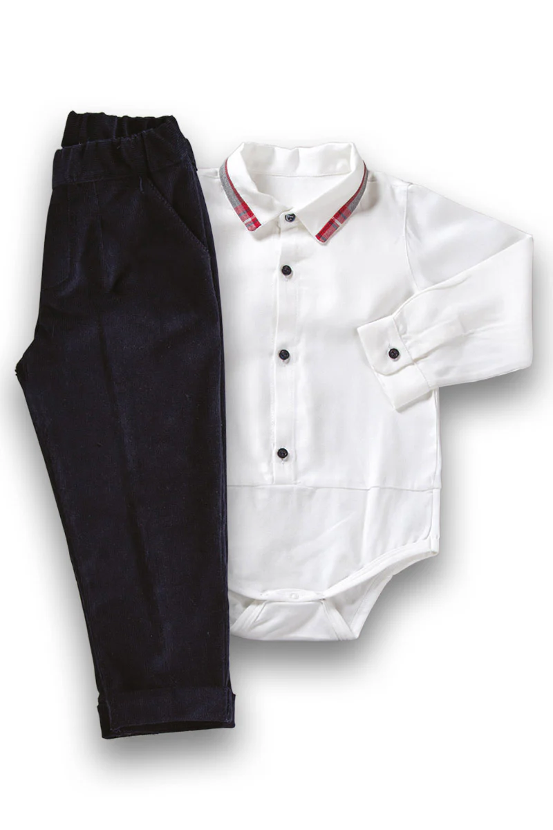 Completo 2 pezzi : body a camicia in flanella con profilo scozzese + pantalone in velluto millerighe