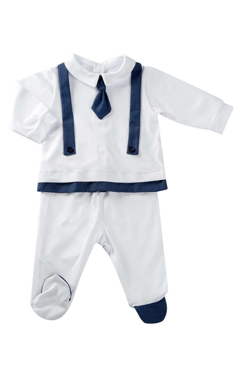 Completo 2 pezzi con inserti, bretelle e cravattino in tela microfantasia