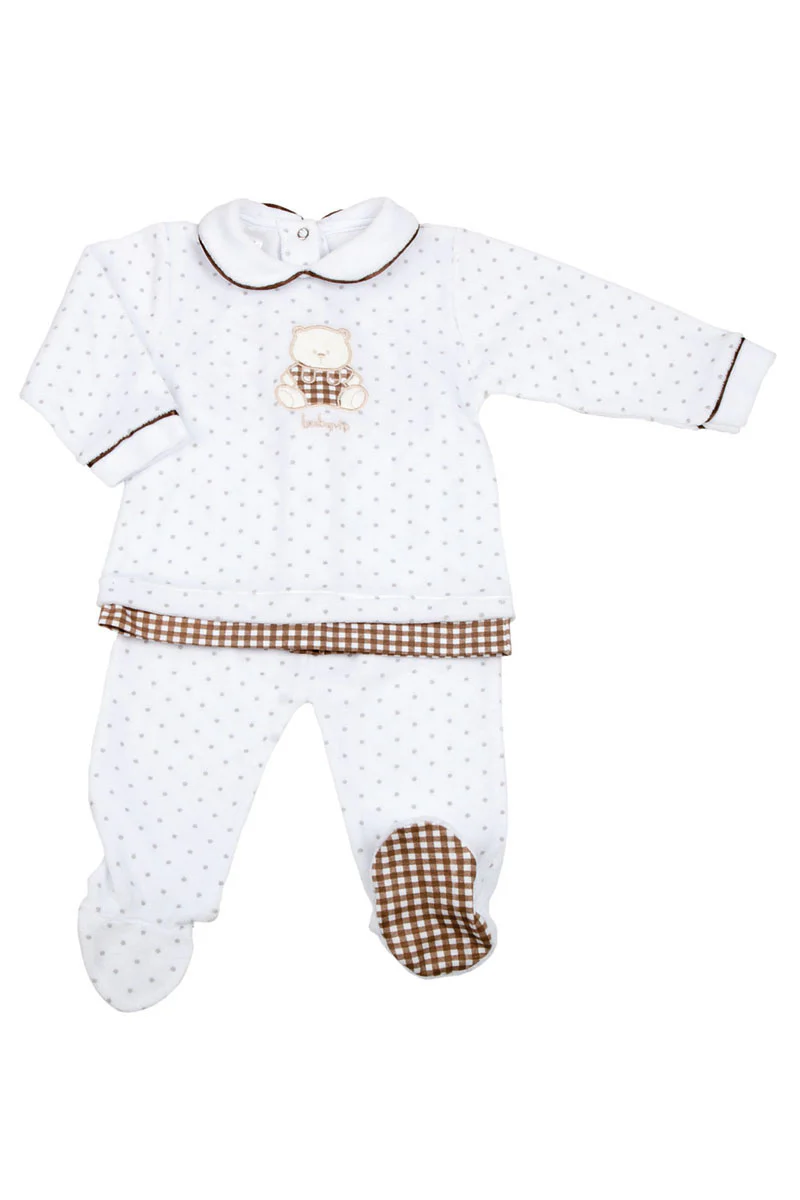 Completo 2 pezzi in ciniglia a pois con ricamo e inserti vichy in contrasto