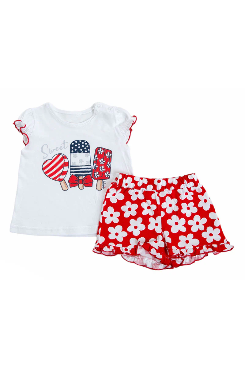 Completo 2 pezzi : T-shirt mezza manica in cotone con stampa, maniche a palloncino con profilo in contrasto + pantaloncino fantasia floeale con rouches sul fondo