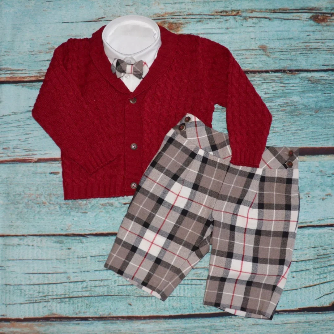 Completo quattro pezzi composto da camica, papillon, pantaloncino a fantasia scacchi e cardigan in filo.