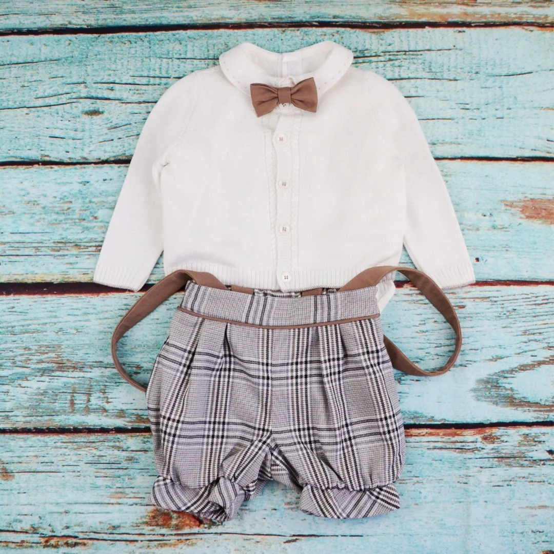 Completo composto da camicia body con papilon, cardigan in filo e pantalone corto a fantasia con bretelle.