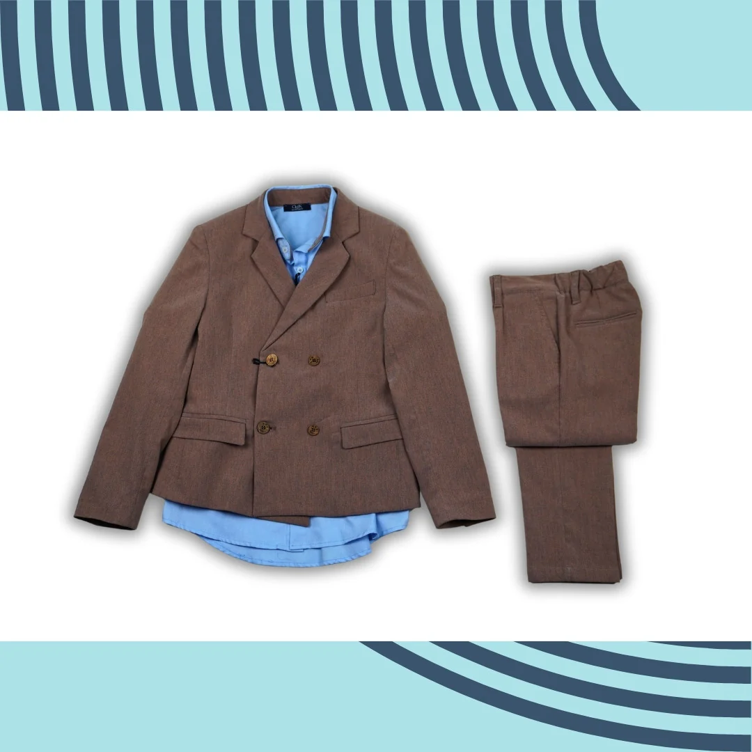 Completo composto da giacca doppiopetto, pantalone con elastico dietro, camicia con contrasti.