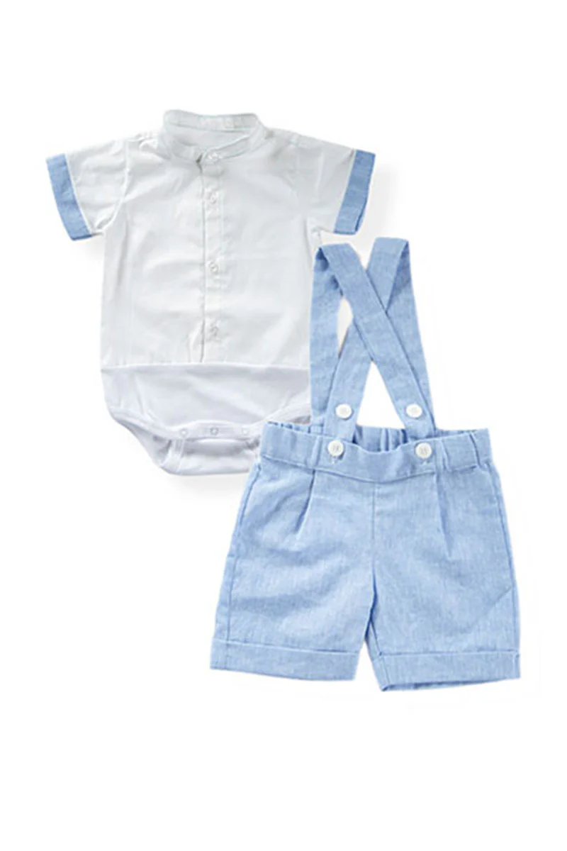 Completo Body a camicia in tela di cotone con collo coreana e inserti in contrasto fondo manica + Bermuda con bretelle, pence e risvolto sul fondo