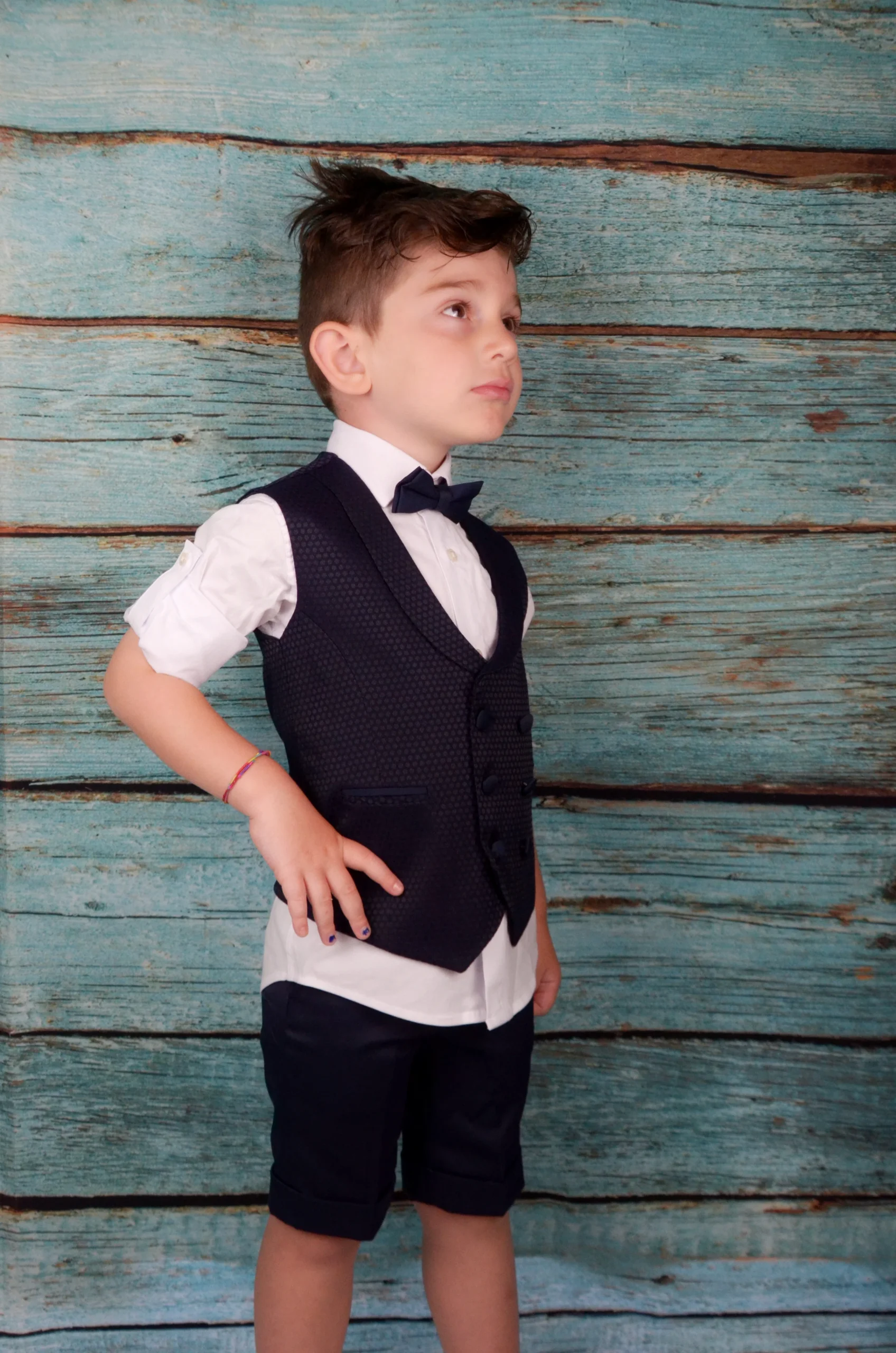 Completo composto da Camicia, Pantaloncino a fantasia , Gilet e Papillon a fantasia .
