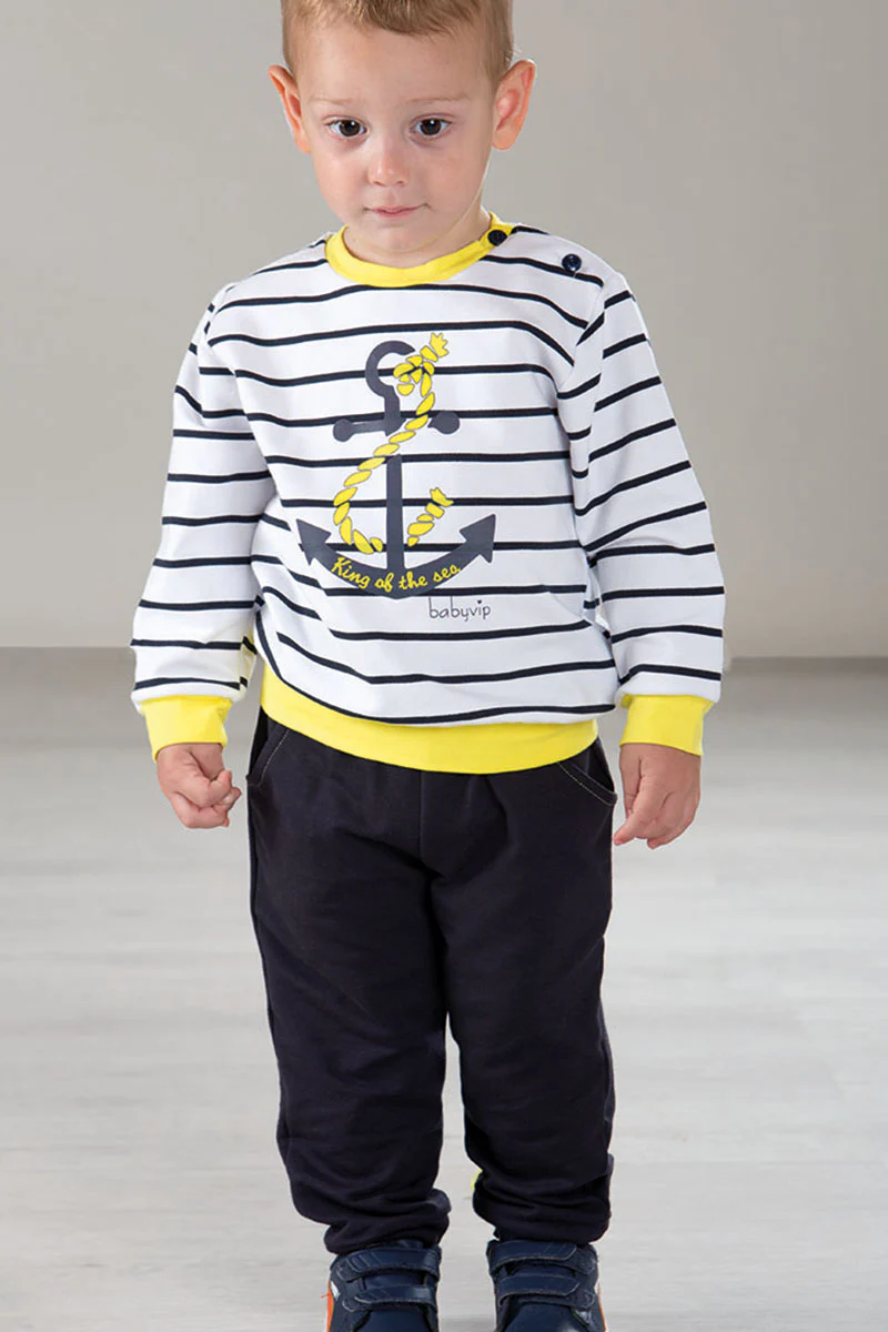 Completo in felpina rigata con stampa bordi in contrasto e pantalone con tasche e polsi sul fondo