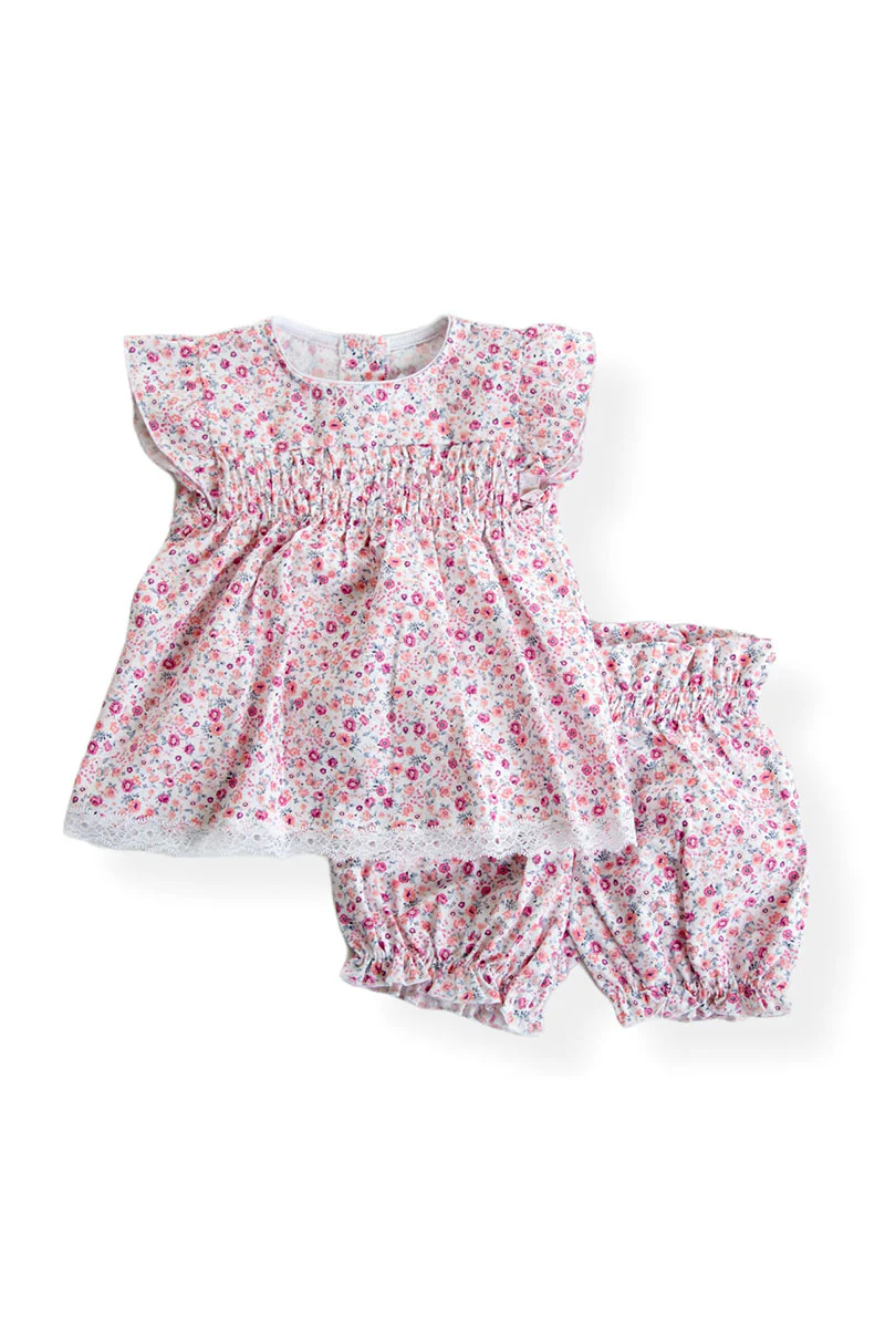 Completo in tela di cotone organico fantasia provenzale con punto smock e pizzo applicato