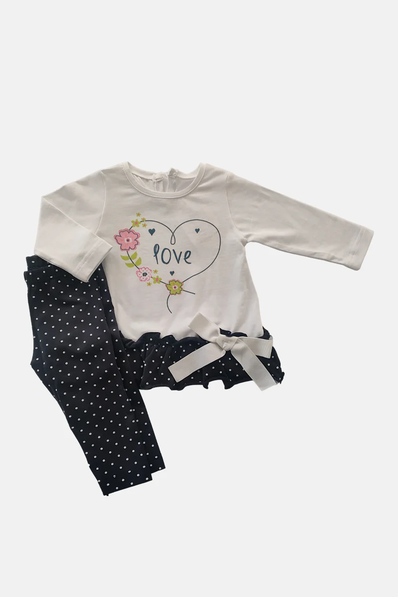 Completo manica lunga in cotone elasticizzato con stampa, balza e fiocco con leggings a pois