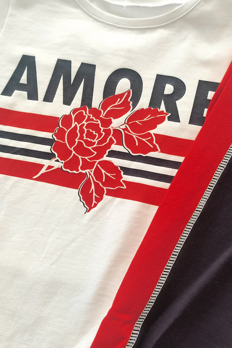 Completo 2 pezzi : T-shirt in cotone elasticizzato con stampa e pantalone in felpina con tasche e stampa sul fondo