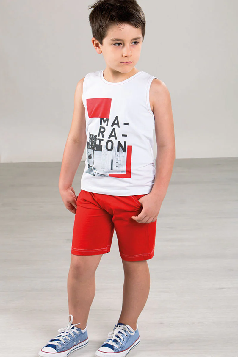 Completo canotta in cotone elasticizzato con stampa e pantaloncino in felpina con risvolti e coulisse in contrasto