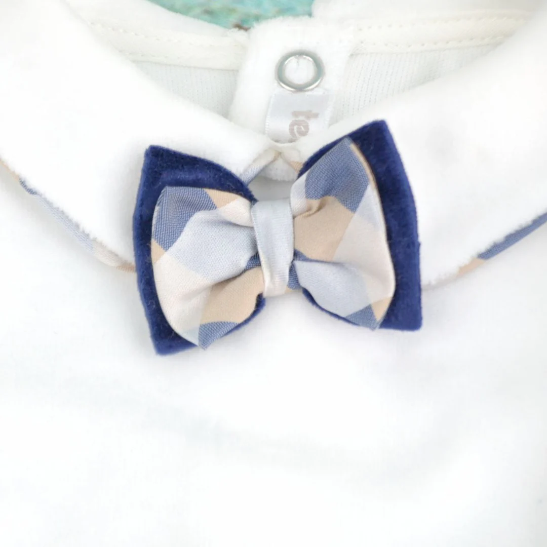 Tutina intera senza piedi in velluto e ciniglia. La tutina è impreziosita da un papillon con tessuto fantasia quadri.
