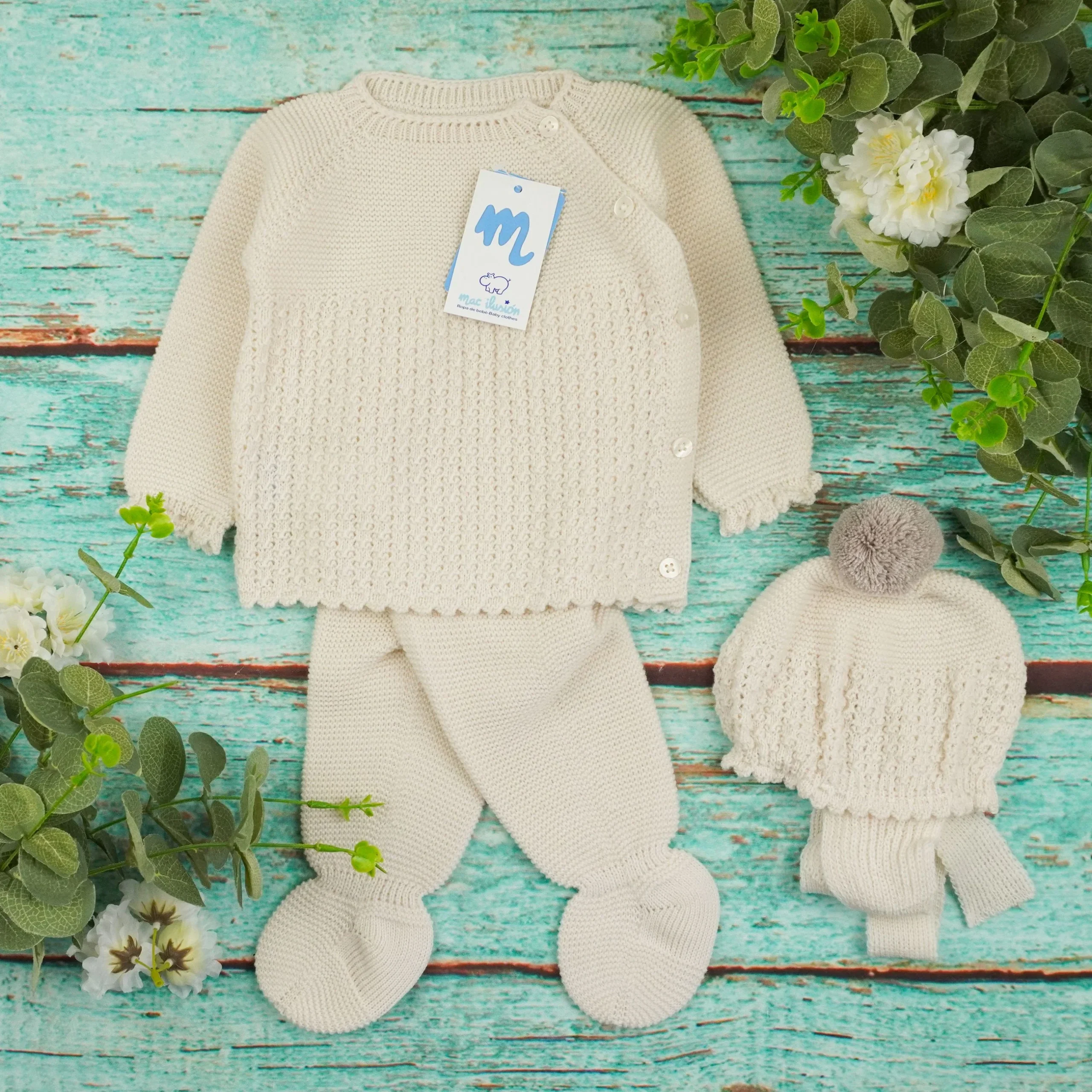 Tutina spezzata, con bottoncini, in filo con piedi e cappellino con pompon. Collezione: ENTERNECER Articolo: 9417.21 Stagione: Autunno/Inverno Brand – Mac Ilusion