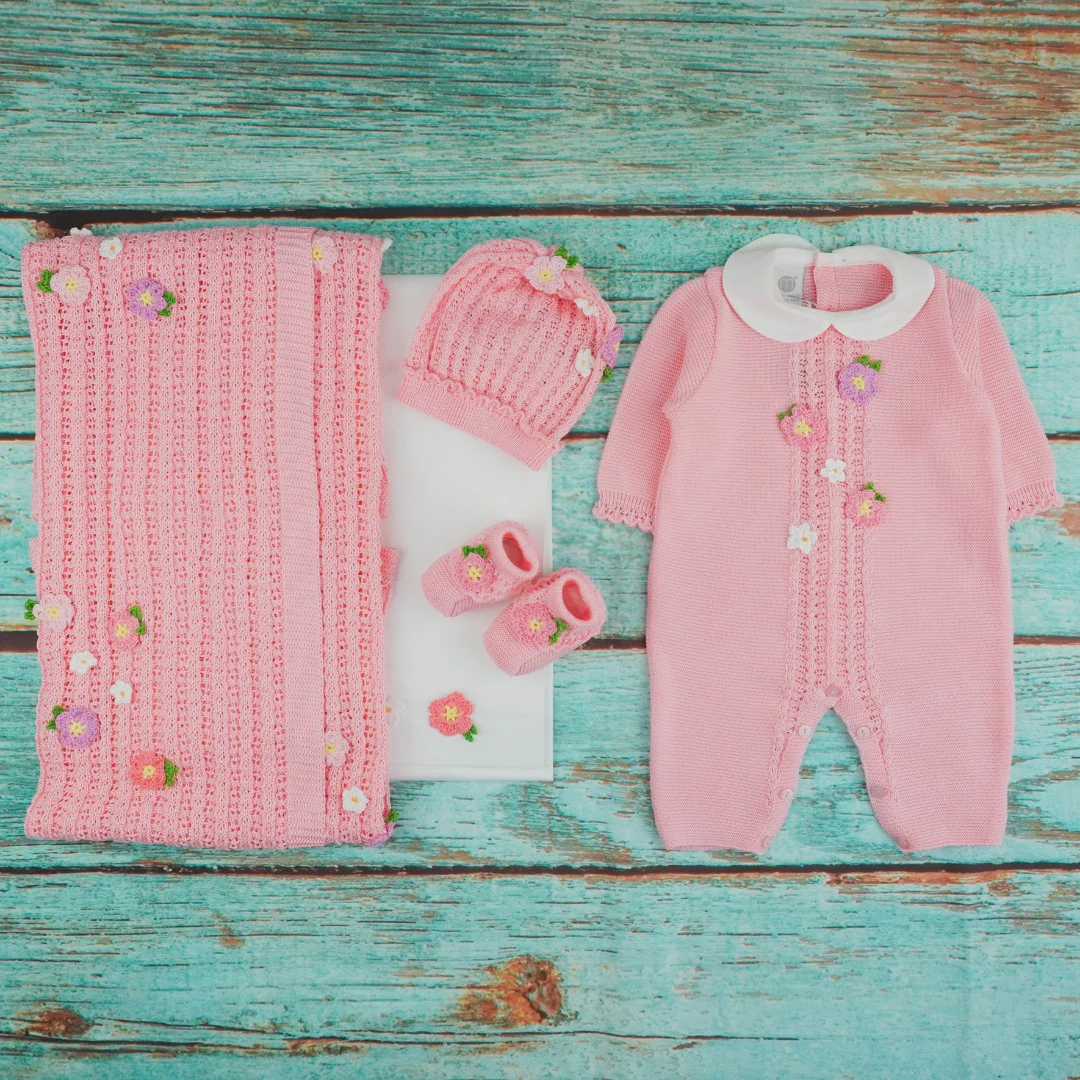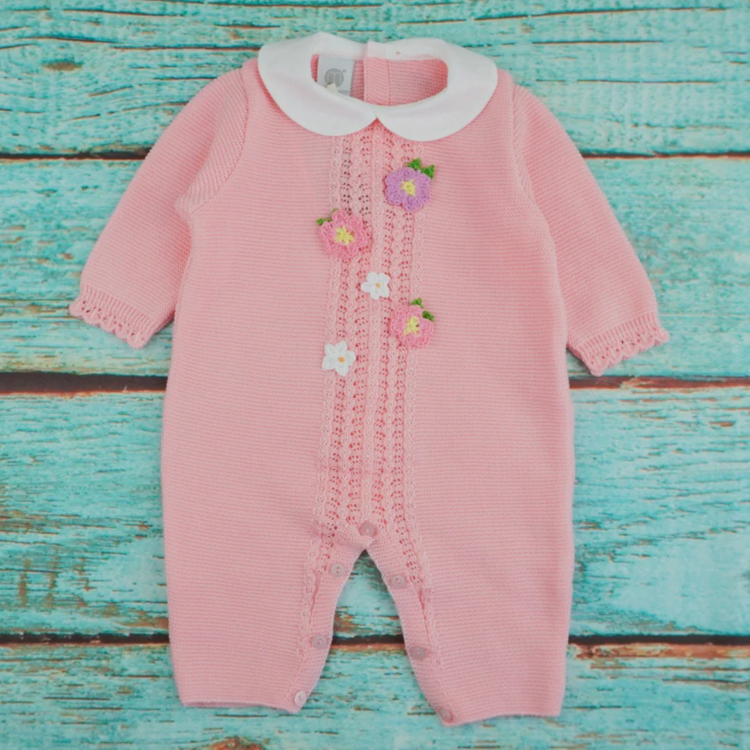 Tutina realizzata in filo di cotone, con una lavorazione particolare sulla fascia centrale. Questo capo meraviglioso presenta applicazioni di fiorellini colorati cuciti a mano, aggiungendo un tocco di vivacità e eleganza al design. Un capo unico per accogliere la tua piccola principessa nel mondo con stile e grazia.
