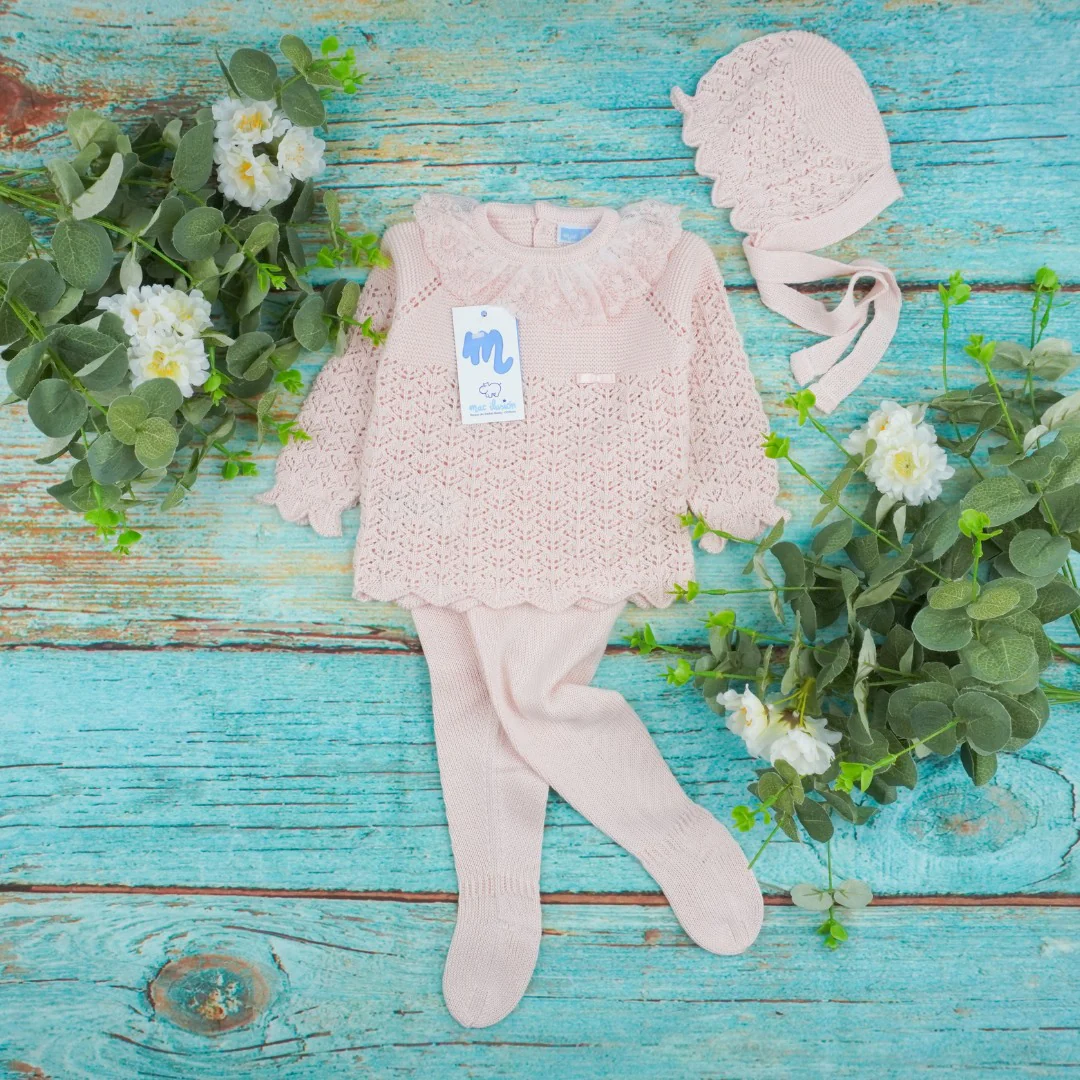 Tutina spezzata con tulle ricamato con piede e cuffia, in filo.