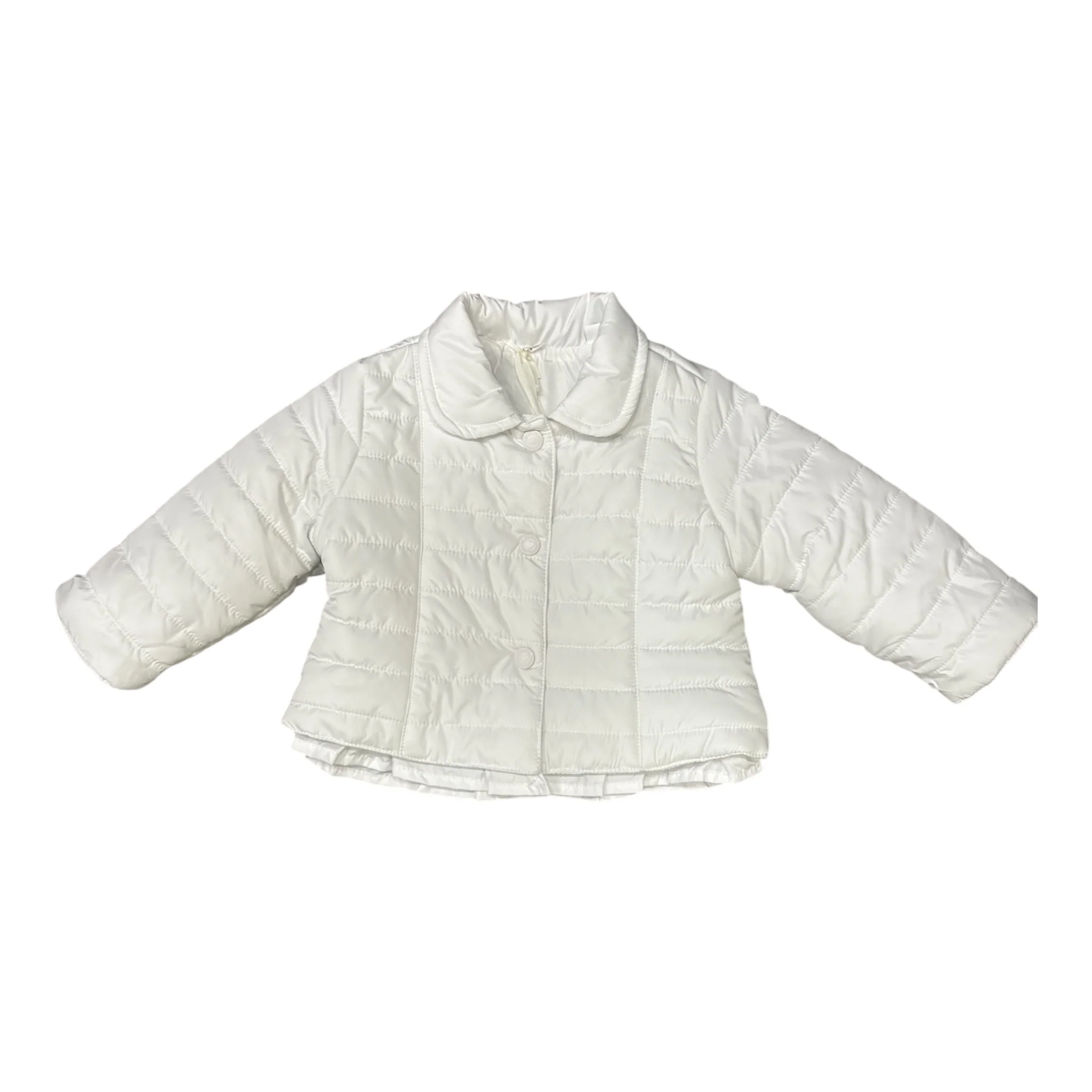 Giubbini trapuntato bianco ideale per la mezza stagione con colletto e particolare rude sul fondo, vestibiàita leggermente sfiancata, molto femminile.Ideale per chiudere una cerimonia ma portabile anche con un look piu’ casual.