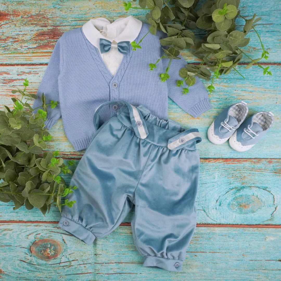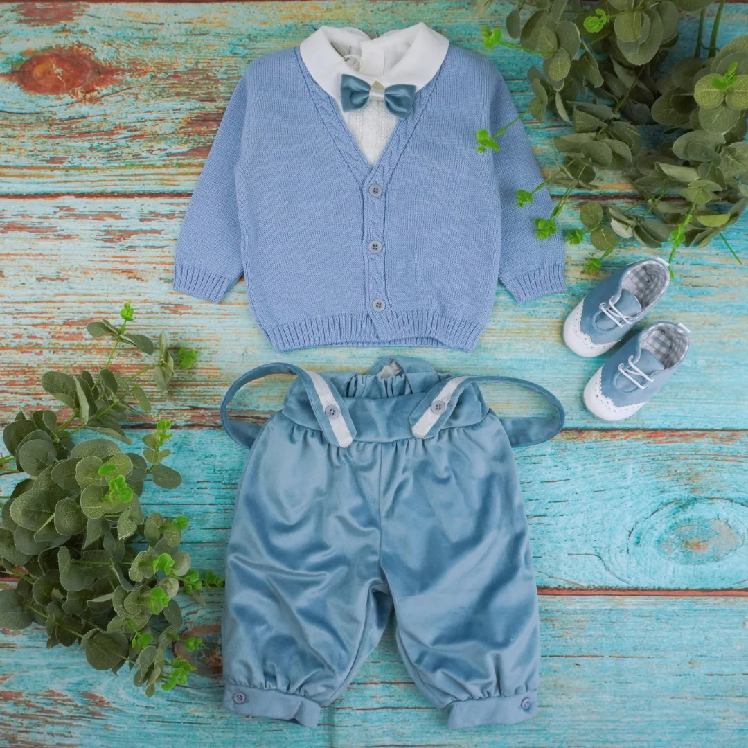 Completo composto da giacchina, pantalone alla zuava con bretelle, camicia e papillon.
