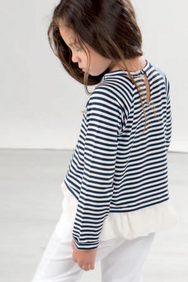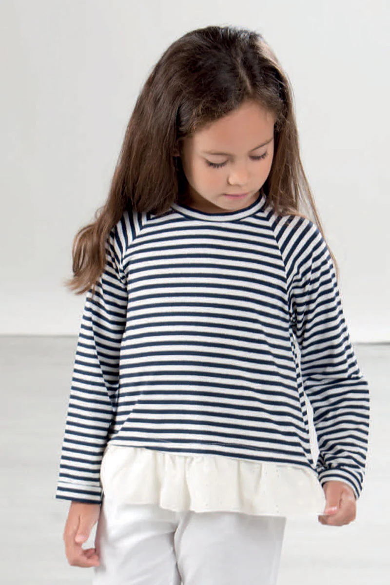 Maglia a manica lunga in maglina rigata con lurex con balza in tela sangallo sul fondo
