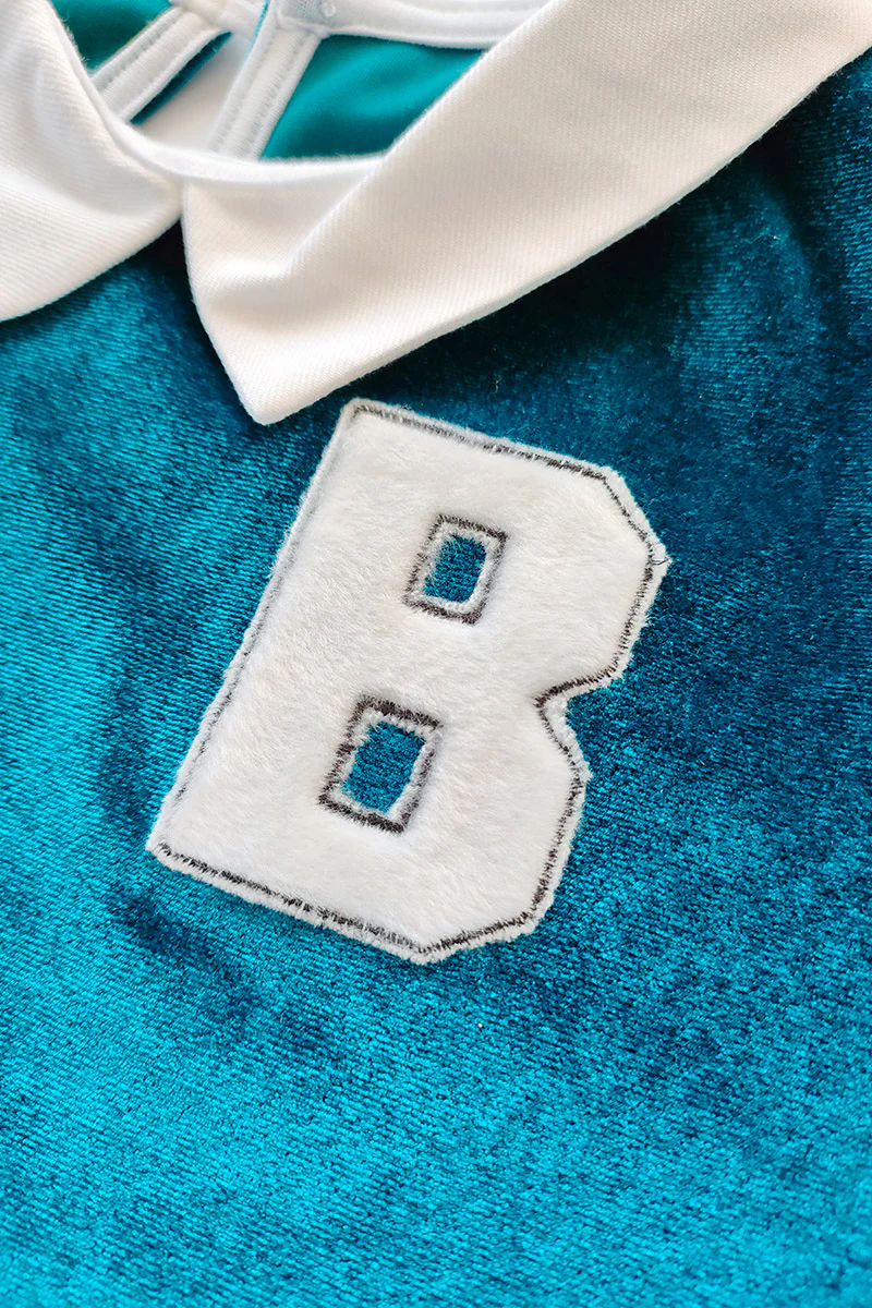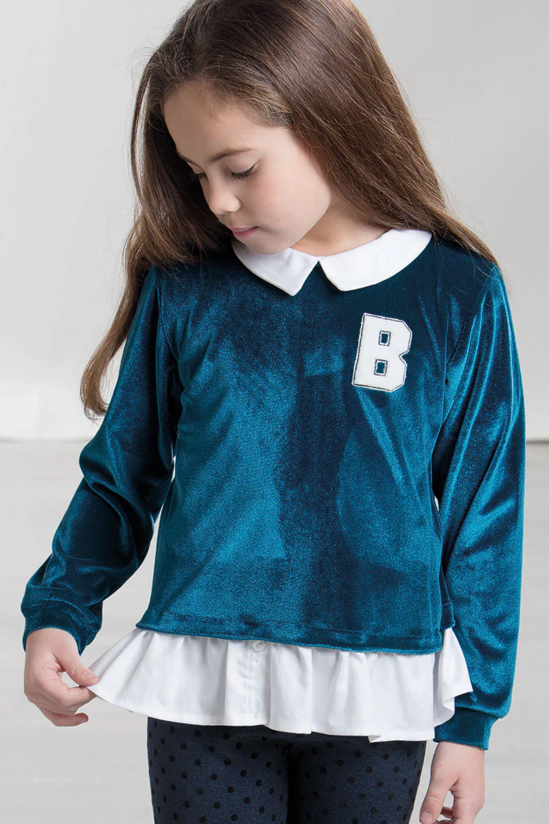Maglia in velluto con inserti in tela di cotone effetto camicia, ricamo lato cuore con inserto in ecopelliccia