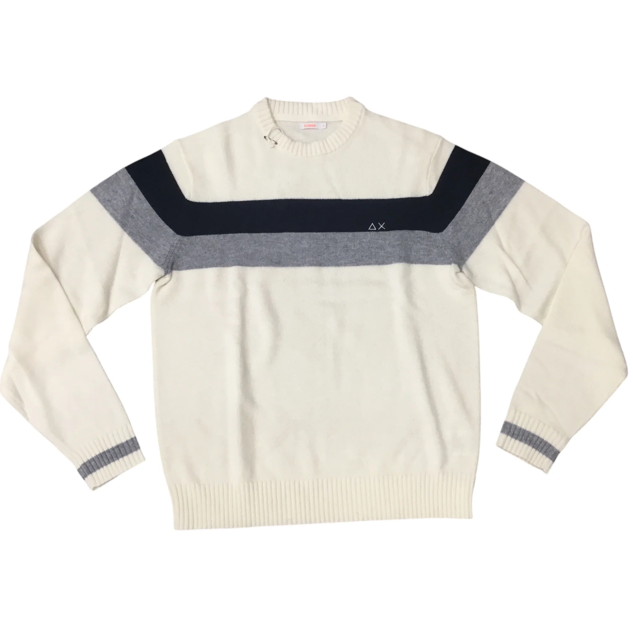 Maglia panna in lana viscosa e cachmire con riga blu e grigia.