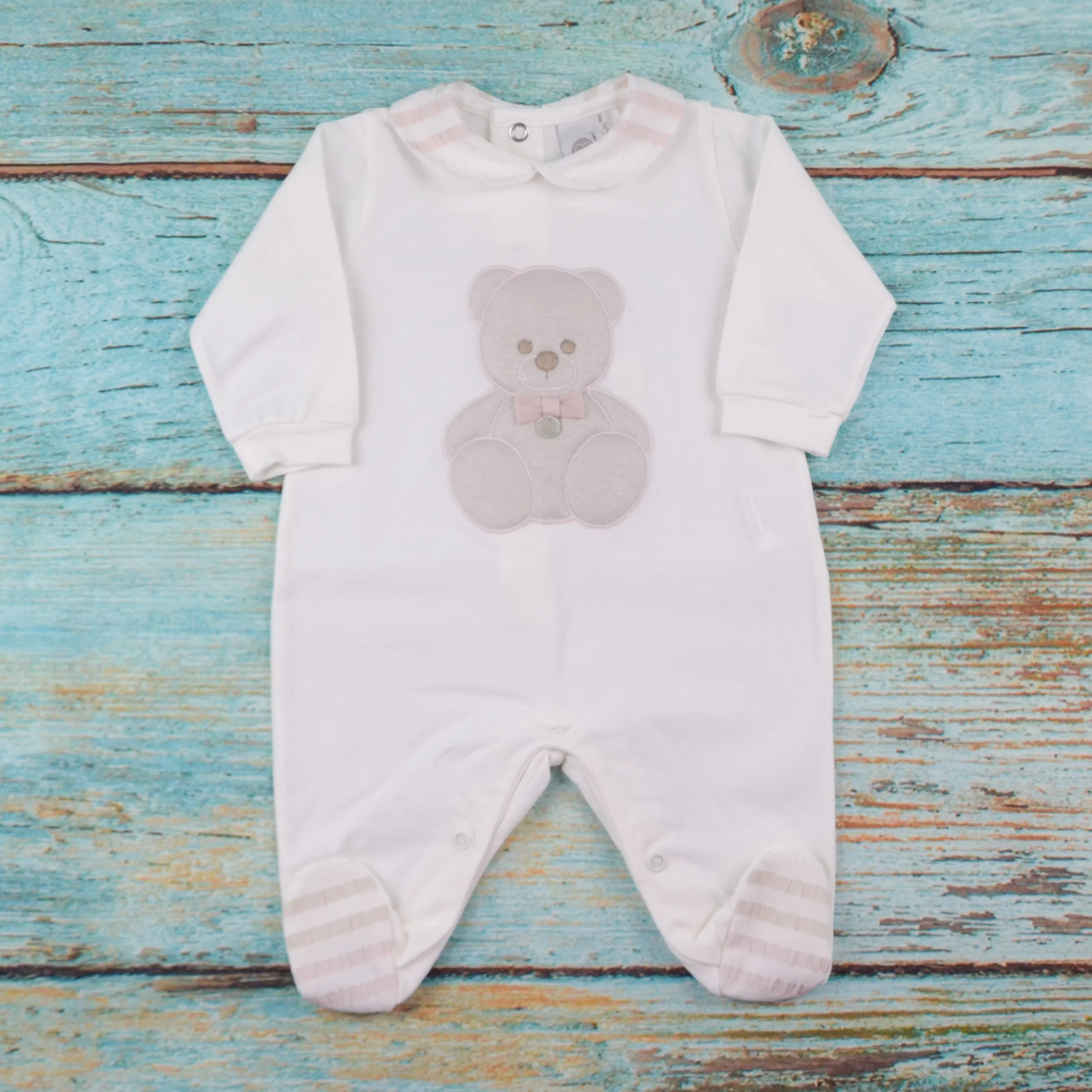 Tutina intera con piede con colletto a fantasia rigata e con orsetta ricamata. Tema: Orsetta Articolo: EF2514,C2313