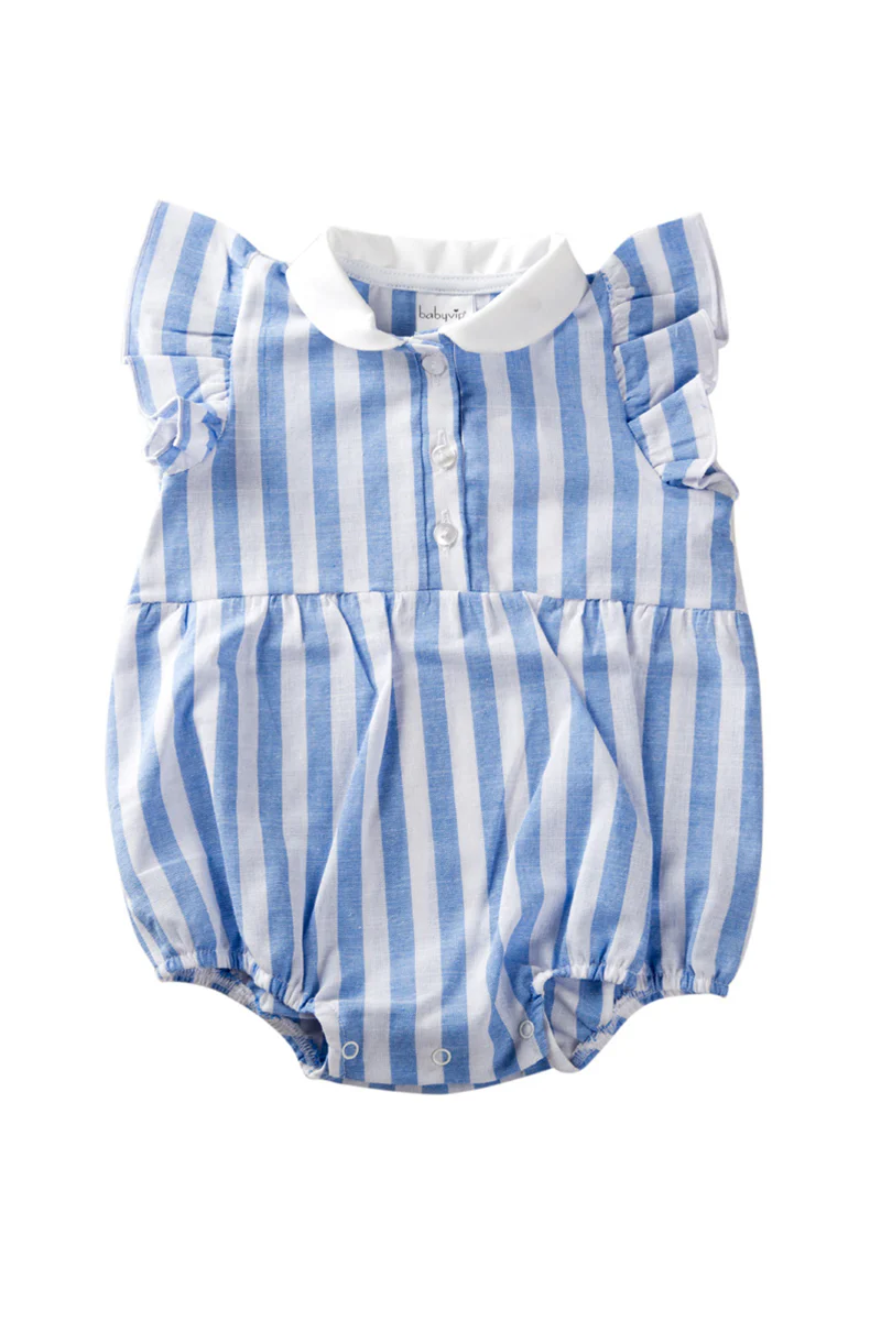 Pagliaccetto in lino rigato con balze. fenda e colletto