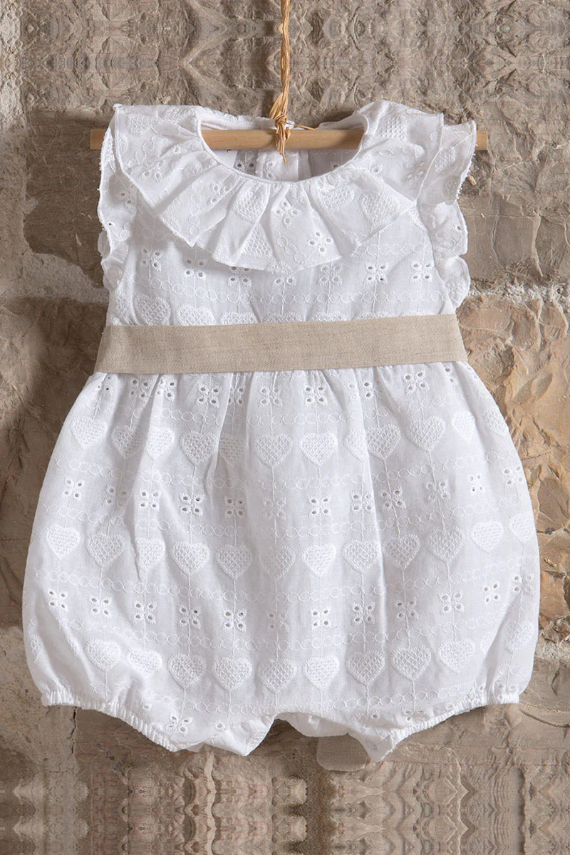 Pagliaccetto in pizzo sangallo con balza allo scollo – alette e cintura in tessuto effetto lino annodato sul retro con fiocco