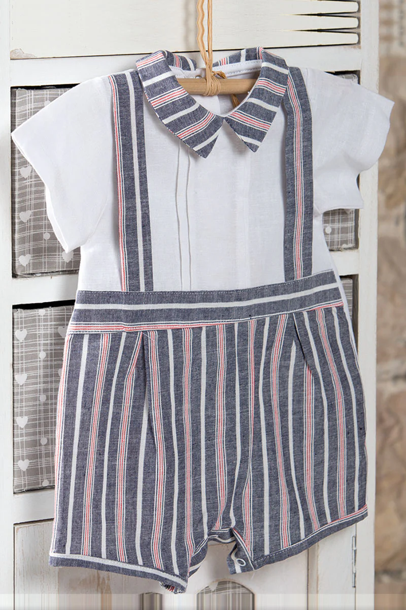 Pagliaccetto in tela di cotone con inserti e bretelle applicate in tessuto effetto lino rigato