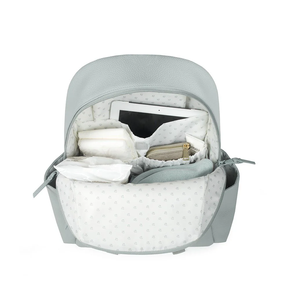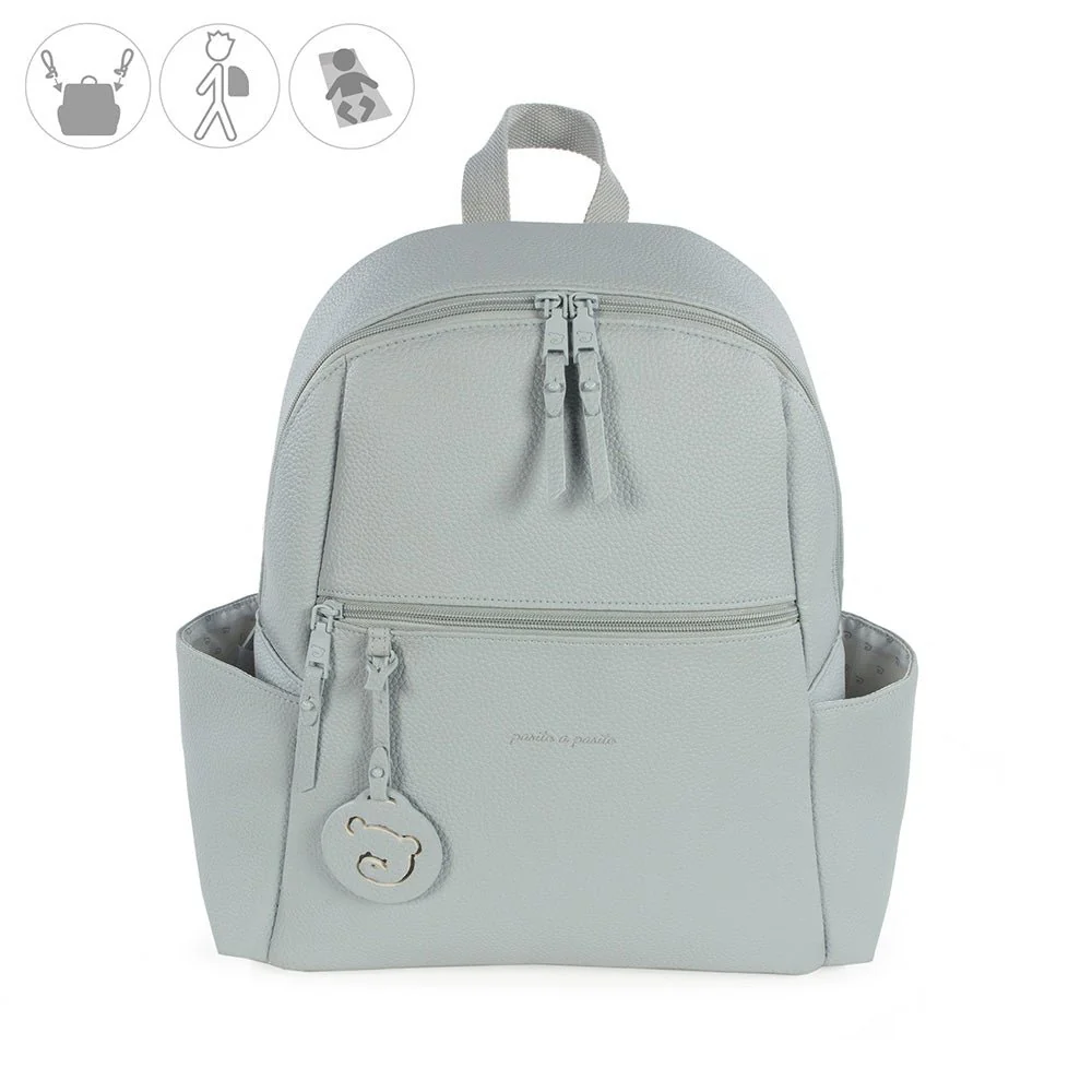 Zaino in similpelle verde mint Yummi. Grande capacità di trasportare tutto cioÌ di cui tu e il tuo bambino avete bisogno. Tasche interne ed esterne per avere tutto a portata di mano e in ordine. Scomparto per laptop o tablet. Ha 2 grandi maniglie regolabili in modo da poterlo utilizzare appeso sul retro e altre due piccole maniglie in modo da poterlo appendere sul carrello del bambino. Si puoÌ lavare a mano o in lavatrice a 30º. I materiali utilizzati sono esenti di coloranti azoici, ftalati e sostanze nocive alla salute. Dimensioni: 30 X 38 X 14 cm