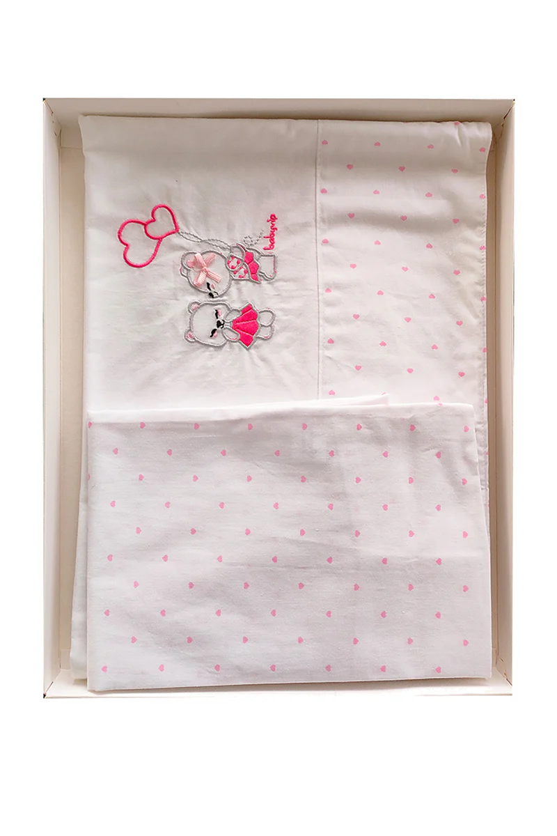 Set lenzuola 3 pezzi per carrozzina e culletta con ricamo orsetti e all over cuori