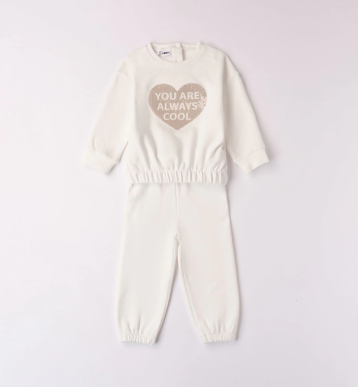 Tuta Jogging composta da felpa tinta unita con cuore in paillettes e pantalone tuta. In Felpa stretch leggermente garzata.