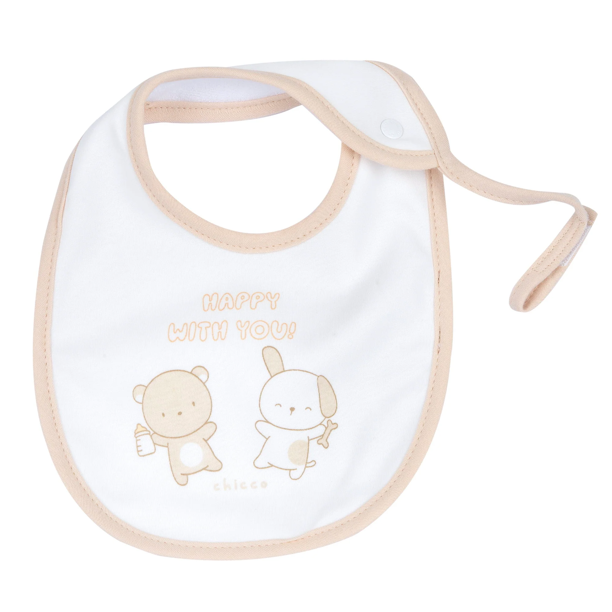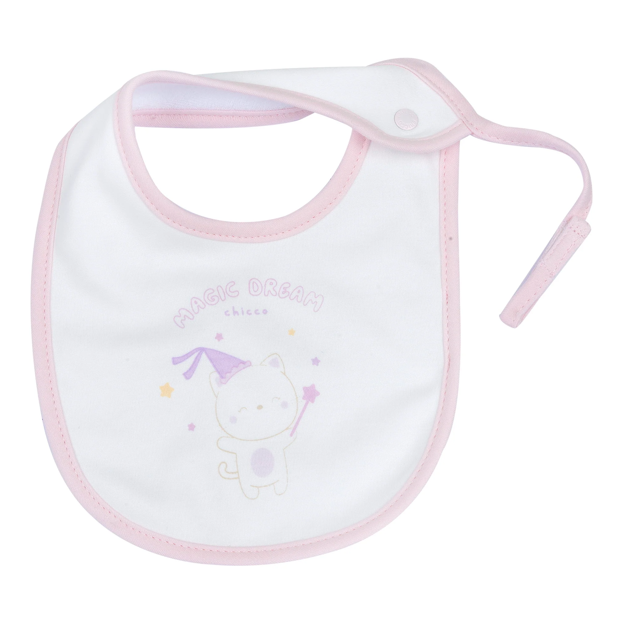 Bavaglino con laccetto porta ciuccio, in interlock con fodera in spugna di cotone e grafica stampata.Apertura regolabile con bottoni automatici. Prodotto con Certificazione Oeko-Tex Tema: C05 Articolo: 09100908000000 Stagione: Autunno/Inverno BRAND – Chicco