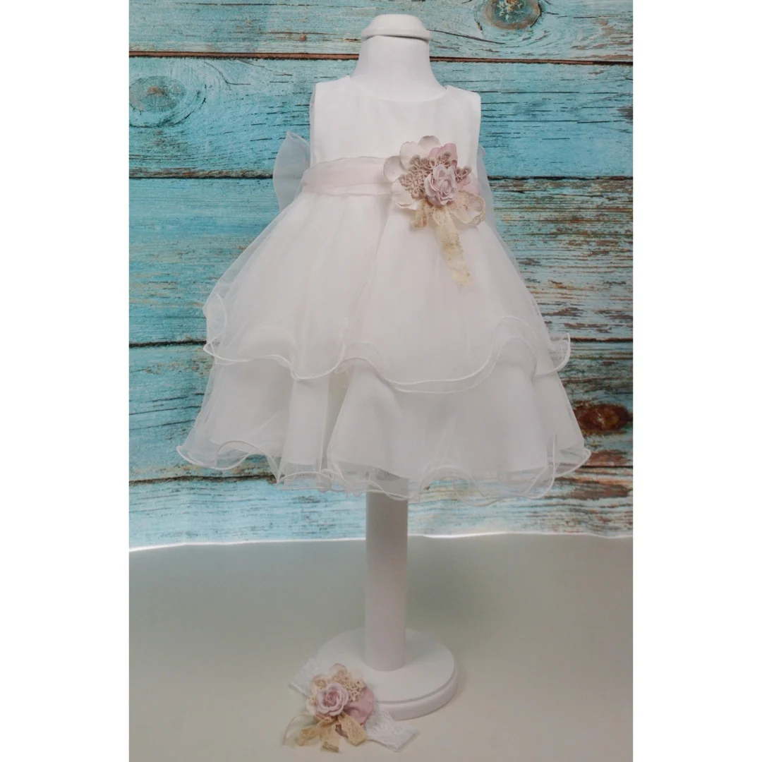 Vestito da battesimo in tulle con cinturino in organza e fiore.