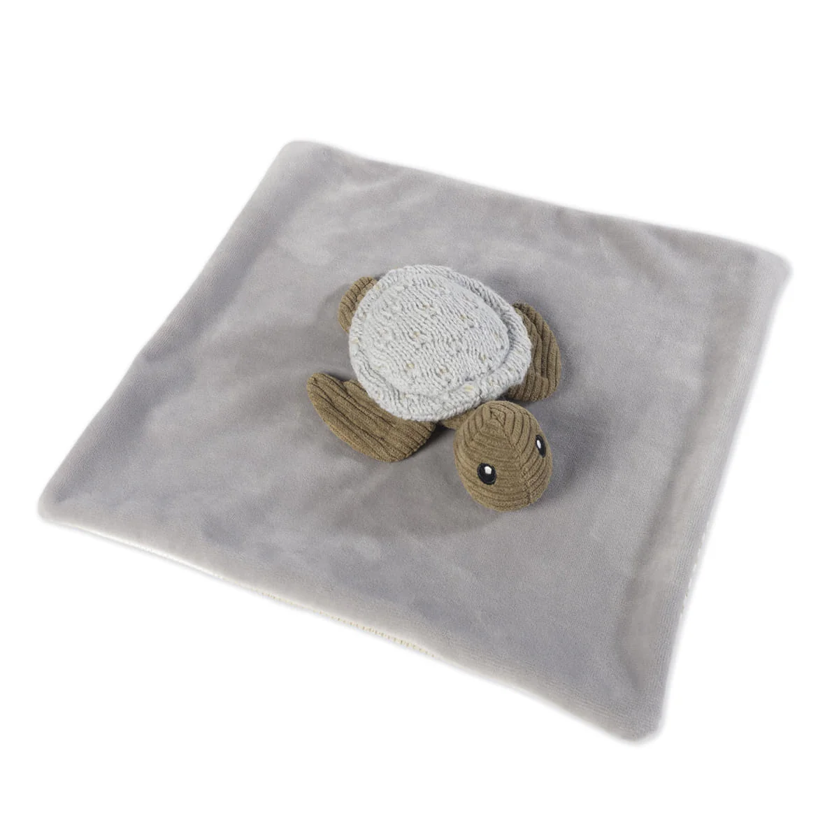 Doudou Tartaruga Olivia marrone per il bambino. Aiuta a rilassare il bambino quando toccato. È realizzato al 70% in poliestere riciclato. Conforme alle normative di sicurezza EN-71 per giocattoli. Misure: 28×28 cm.